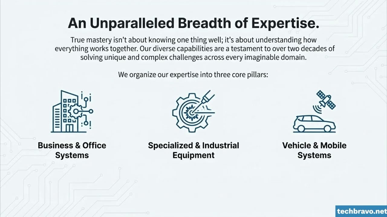 Tech Bravo provides comprehensive consulting, installation, training, repair, and maintenance services across a diverse array of platforms. If you don’t see what you are looking for in our our full Services List, please contact us for a FREE consult to see how we can help!