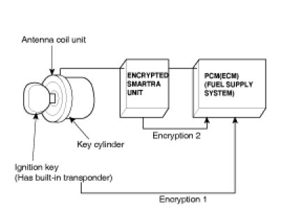 1. The PCM(ECM) carries out a check of the ignition key using a special encryption algorithm, which is programmed into the transponder as well as the PCM(ECM) simultaneously. Only if the results are equal, the engine can be started. The data of all transponders, which are valid for the vehicle, are stored in the PCM(ECM).