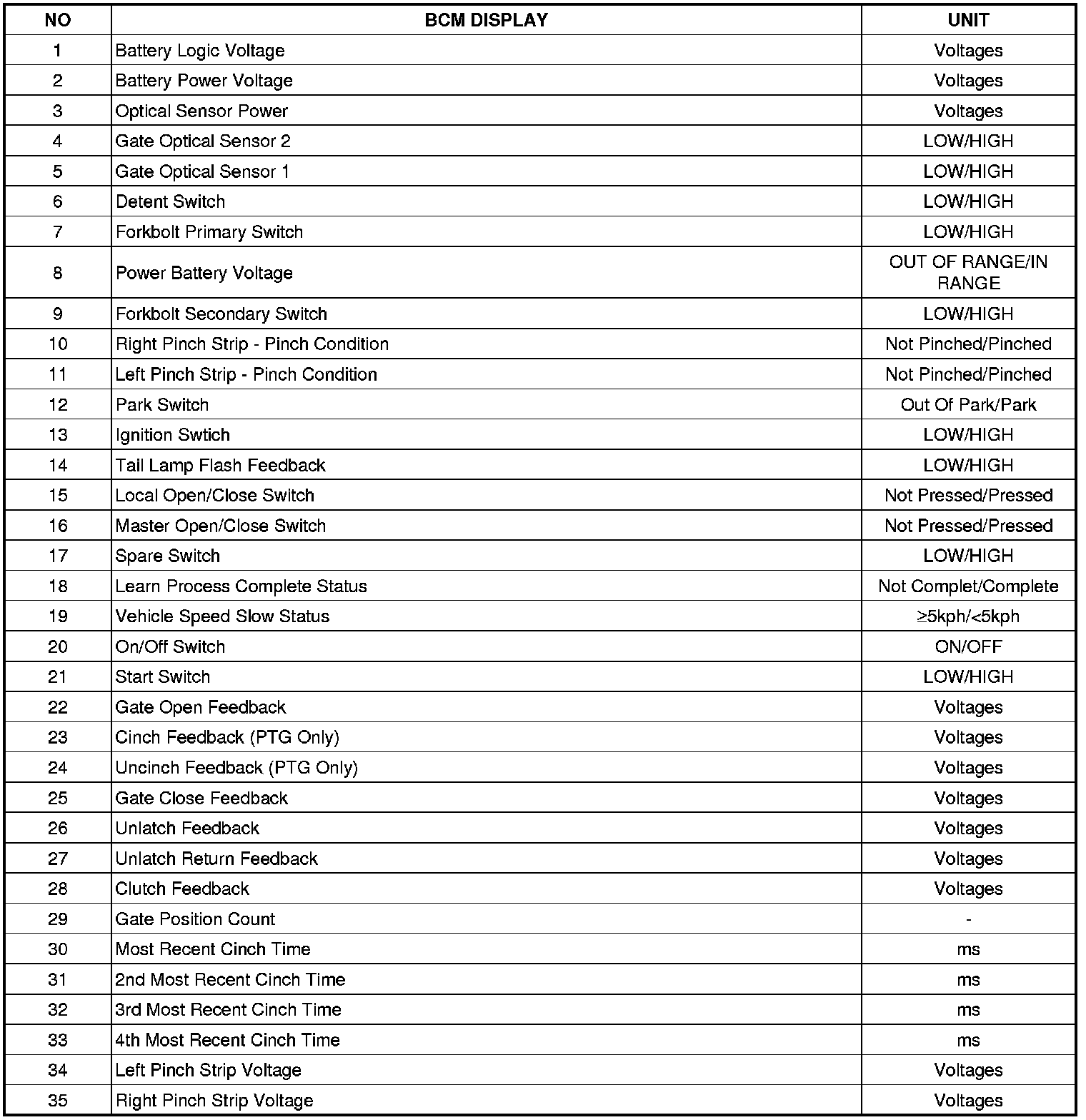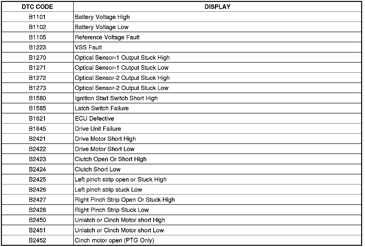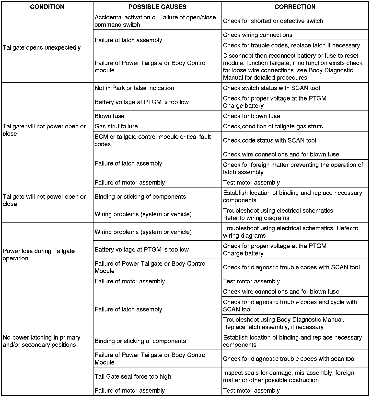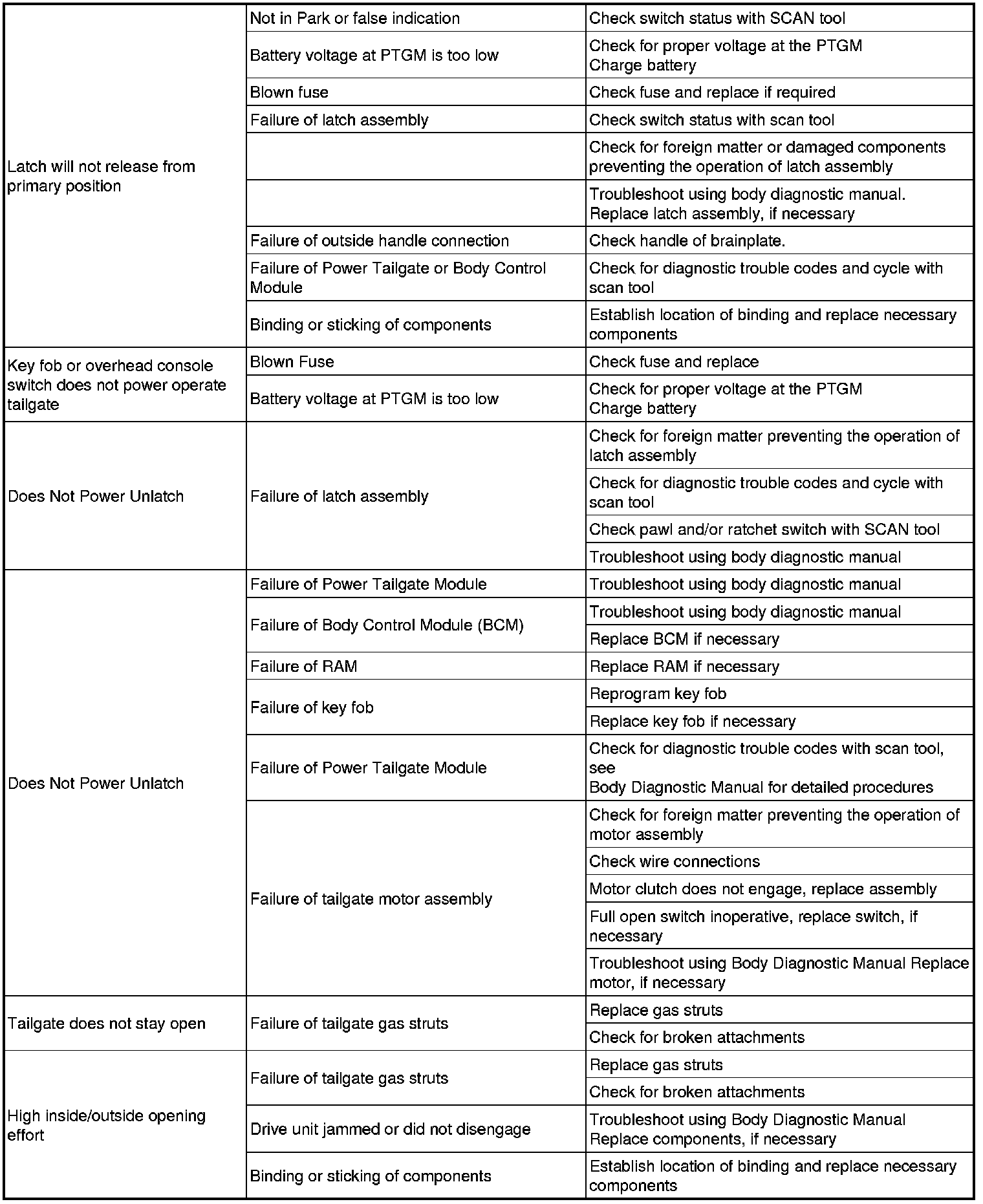 Following are quick reference diagnostic tables to help when diagnosing and testing the power tailgate system.
