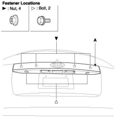 2. After loosening the mounting bolt and nuts, then remove the tailgate garnish (A).