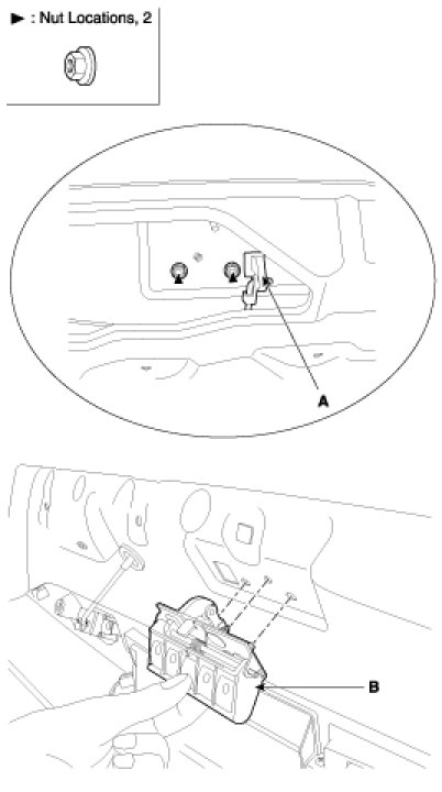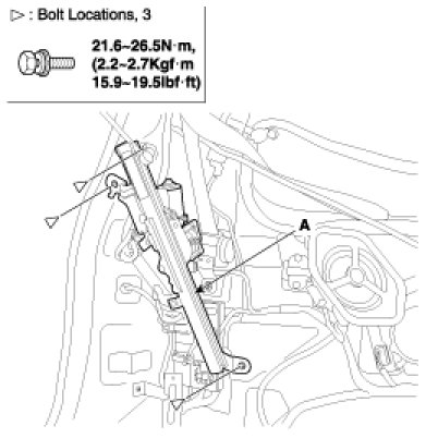 5. After loosening the mounting bolts, then remove the tailgate motor assembly (A).