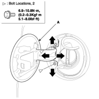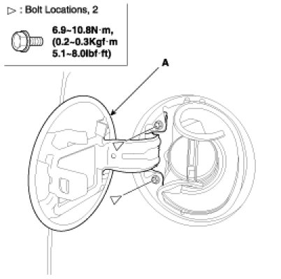 2. Loosen the bolts, then remove the fuel fill door (A).