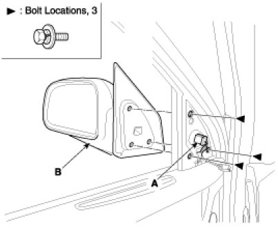 3. After disconnecting the connector (A), remove the outside rear view mirror (B).
