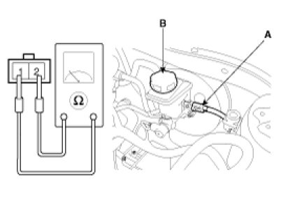 1. Remove the connector (A) from the switch located at the brake fluid reservoir (B).