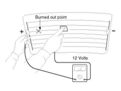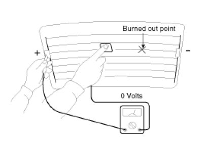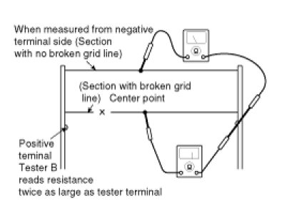 5. Use an ohmmeter to measure the resistance of each heater line between a terminal and the center of a grid line, and between the same terminal and the center of one adjacent heater line. The section with a broken heater line will have a resistance twice as that in other sections. In the affected section, move the test lead to a position where the resistance sharply changes.
