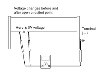4. To check for open circuits, slowly move the test lead in the direction that the open circuit seems to exist. Try to find a point where a voltage is generated or changes to 0V. The point where the voltage has changed is the open-circuit point.