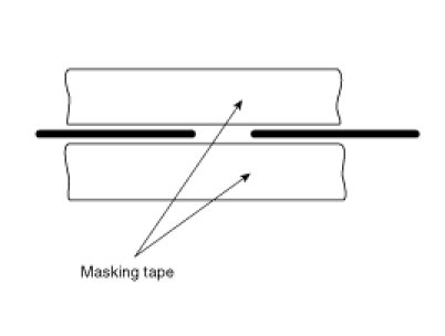 Wipe the glass adjacent to the broken heater line, clean with silicone remover and attach the masking tape as shown. Shake the conductive paint container well, and apply three coats with a brush at intervals of about 15 minutes apart. Remove the tape and allow sufficient time for drying before applying power. For a better finish, scrape away excess deposits with a knife after the paint has completely dried. (Allow 24 hours).