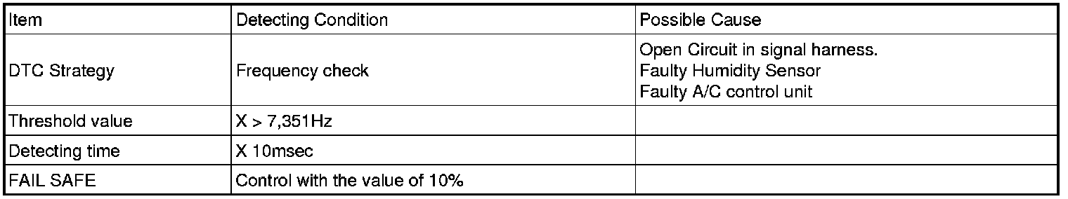 Humidity sensor transforms measured humidity into frequency value and delivers it to A/C Control unit. If ambient air temperature or in-car humidity is in a specified range that can makes frost on the window glass, A/C will be activated to control in-car humidity to prevent frost on the window glass.