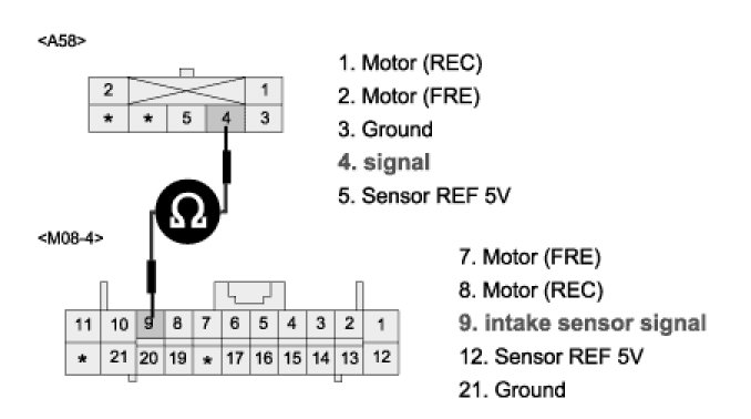 3. Measure resistance between terminal "4" of Intake actuator and terminal "9" of A/C control unit.