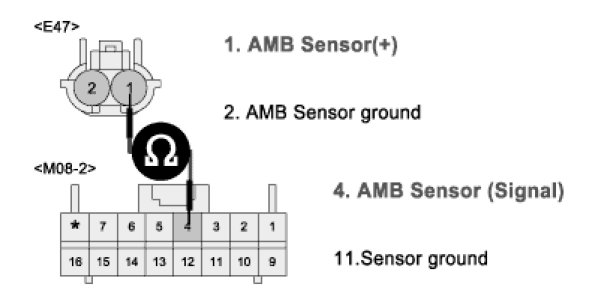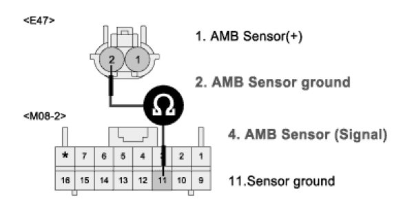 3. Measure resistance between terminal "2" of ambient temp. sensor and terminal "11" of A/C Control Unit