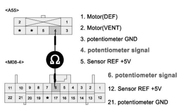 3. Measure resistance between terminal "4" of DR Direction actuator and terminal "6" of A/C control unit.
