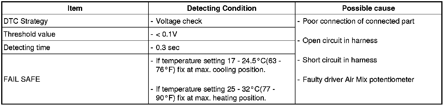** Parameter of "Rear Air Mix Potentiometer" will be fixed at 100%(or any value above 90%), or 0% (or any value below 10%), if there is any fault in Rear Air Mix potentiometer.