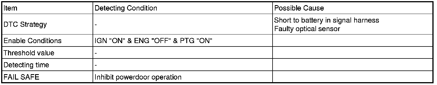 Power Tail Gate (here in after PTG) is the system which moves tail gate of vehicle by electronic motor so that user can open or close door with less force than required on manual operation. To monitor system operation such as speed and position of gate, PTG uses optical sensor. Optical sensor is located at channel and pinion assembly and always makes a pair to distinguish moving direction of door. Signal of optical sensor is pulse signal and used for control of motor speed, gate position and detecting obstacle.