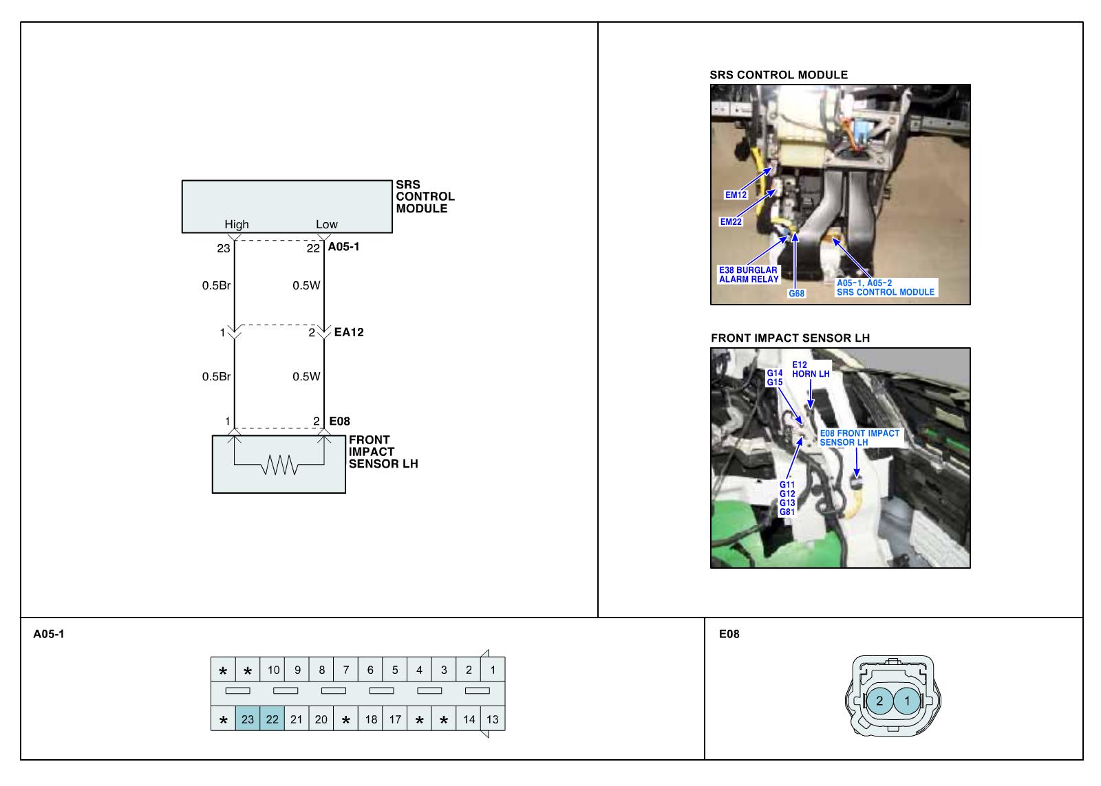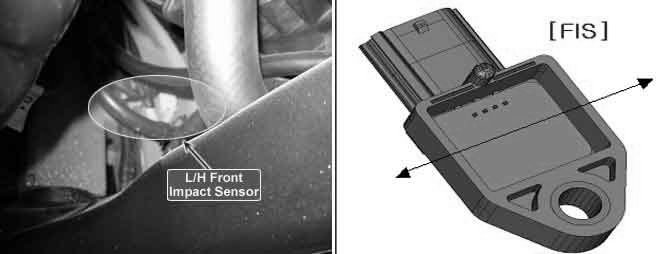 Front Impact Sensor (FIS) located at both sides of the front of engine room detects head-on collision. When FIS delivers collision signal to SRSCM, SRSCM checks if safing sensor located in SRSCM detects collision. and if both FIS and safing sensor detects collision simultaneously, SRSCM operates front air bag.