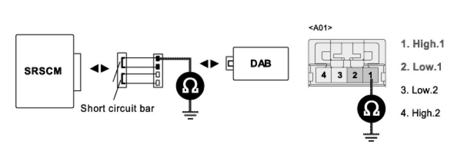 4. Measure resistance between terminal "1" or "2" of the DAB harness connector and chassis ground.