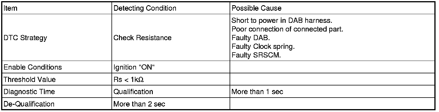 Driver Air bag module (here in after referred to DAB) located at center of steering wheel protects driver by reducing impact of collision. DAB is consist of air bag, pat cover and inflator. There are power, circuit for ignition, gas generator and diffuser screen in inflator. Air bag reduces impact of collision by filled up gas. In collision, pat cover splits and through this crack, air bag emerges and deploys. Inflator generates gas that expands air bag. Clock spring is located between steering wheel and column. It connects SRSCM to DAB.