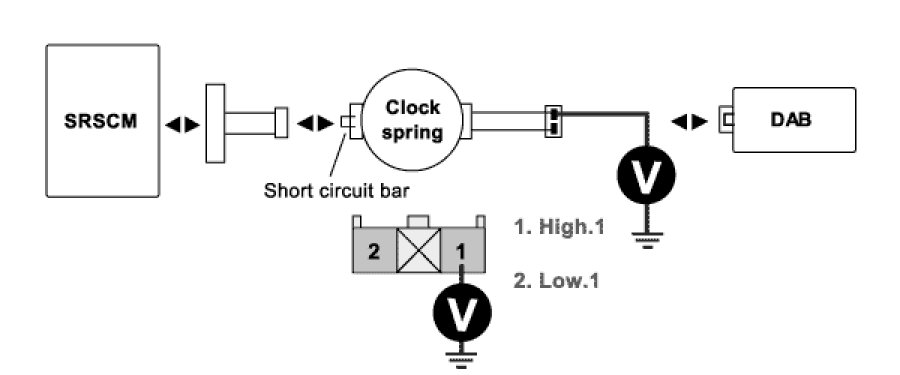 5. Measure Voltage between terminal "1" or "2 "of the clock spring harness connector and chassis ground.