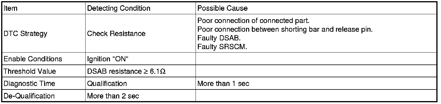 The SRSCM sets DTC B1378 if the measured resistance value of DSAB circuit is more than the threshold value.