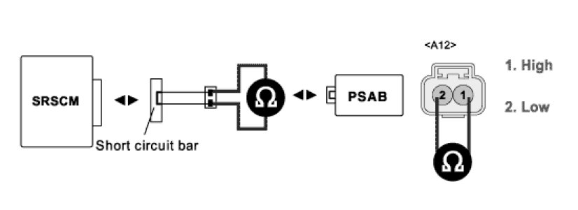 4. Measure resistance between terminal "2" and "1" of the PSAB harness connector.