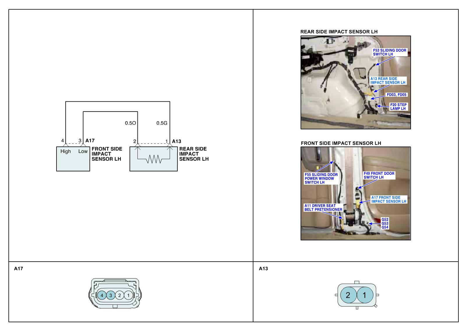 Side Impact Sensor (SIS) is located in both side of center pillar detects broad collision. When SIS delivers collision signal to SRSCM, SRSCM checks if safing sensor located in SRSCM detects collision. and if both SIS and safing sensor detects collision simultaneously, SRSCM operates side air bag.