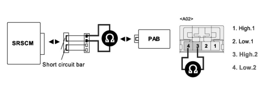 4. Measure resistance between terminal "3" and "4" of the PAB harness connector.