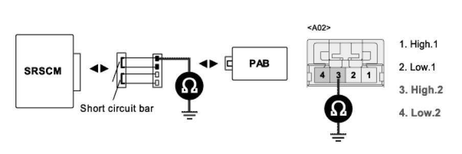 4. Measure resistance between terminal "3" or "4" of the PAB harness connector and chassis ground.