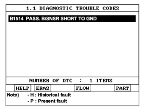1) Displaying nothing (no DTC) or DTC with label "H"(historical) shows that Fault is intermittent caused by poor contact in the part's and/or SRSCM connector or was repaired and SRSCM memory was not cleared.