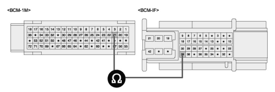 2. Measure resistance between terminal "BCM-IM21" and terminal "BCM-IF39" of IPM.
