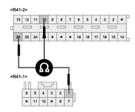 2. Measure resistance between terminal "R41-2-10" and terminal "R41-2-26, R41-1-1" of PTG.