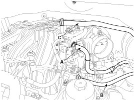 17. Disconnect the PCSV hose (A), fuel hose (B), brake booster vacuum hose (C).