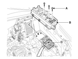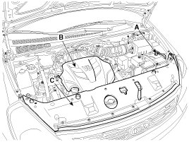 5. Disconnect the battery positive terminal (A) and then remove the battery clamp (B), battery (C).