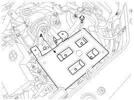 27. Disconnect the ground cable (A), and then remove the transaxle mounting bracket through bolt (B).