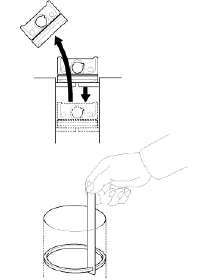(1) Install the ring compressor, check that the bearing is securely in place, then position the piston in the cylinder, and tap it in using the wooden handle of a hammer.