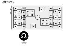 3. Measure the resistance between wind shield defogger power circuit of FAM (BEC-FE-3) and chassis ground.