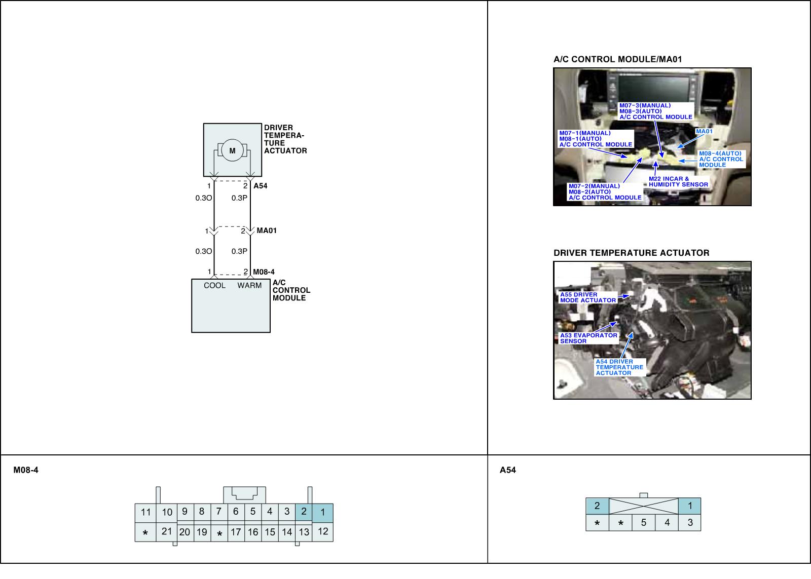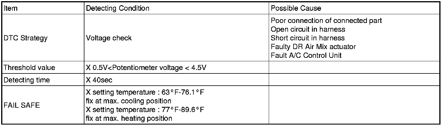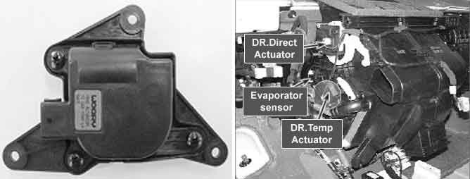 Temperature control actuator located at heater unit. It contains temp motor that changes temp door position and potentiometer that monitors position of temp door. Temperature control actuator regulates the temperature by the procedure as follows. Signal from control unit adjusts position of temp door by operating temp motor and then temperature will be regulated by the hot/cold air ratio decided by position of temp door. In operation, potentiometer delivers temp door position transformed into voltage value to A/C ECU.