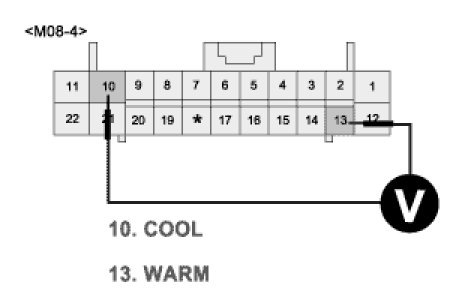 3. Measure voltage between terminal "10" and "13" of A/C Control Unit while operating the temp switch.