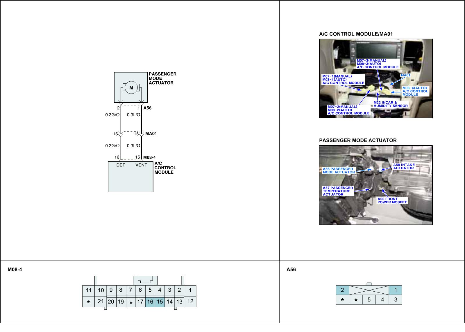 The mode control actuator mounted on heater unit adjusts position of mode door by operating Direction Motor in accordance with signal of A/C control unit. Pressing mode select switch makes the mode control actuator shift in order of vent-> B/L -> floor -> mix.