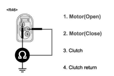 2. Measure resistance between terminal "R46-1,2" of door motor and chassis ground.