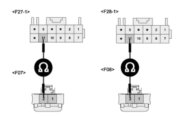 2. Measure resistance between terminal "F28-1-11, F27-1-11" of PSD and terminal "F07-2, F08-2" of door clutch.