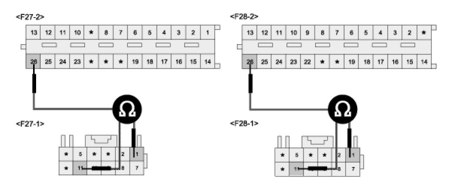 2. Measure resistance between terminal "F28-1-11, F27-1-11" and terminal "F28-2-26, F27-2-26 : F28-1-1, F27-1-1" of PSD.