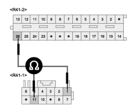 2. Measure resistance between terminal "R41-1-11" and terminal "R41-1-1, R41-2-26" of PTG.