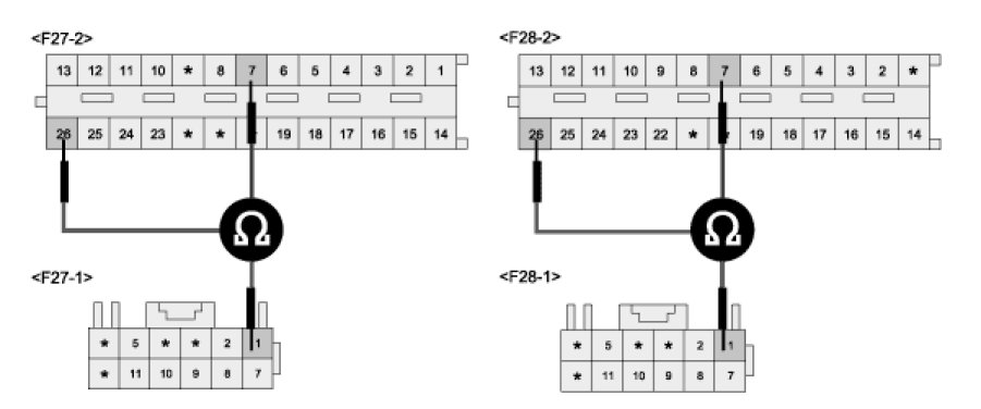 2. Measure resistance between terminal "F28-2-7, F27-2-7" and terminal "F28-2-26, F27-2-26 : F28-1-1, F27-1-1)" of PSD.