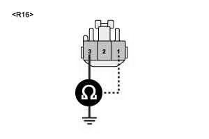 3. Measure the resistance between rear wiper motor signal circuit connector terminal (R16-3) and ground circuit connector terminal (R16-1).