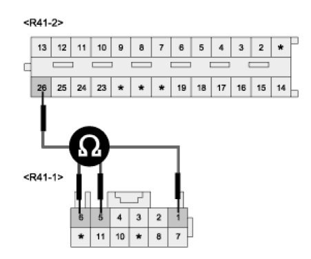 2. Measure resistance between terminal "R41-1-5,6" and terminal "R41-2-26, R41-1-1" of PTG.