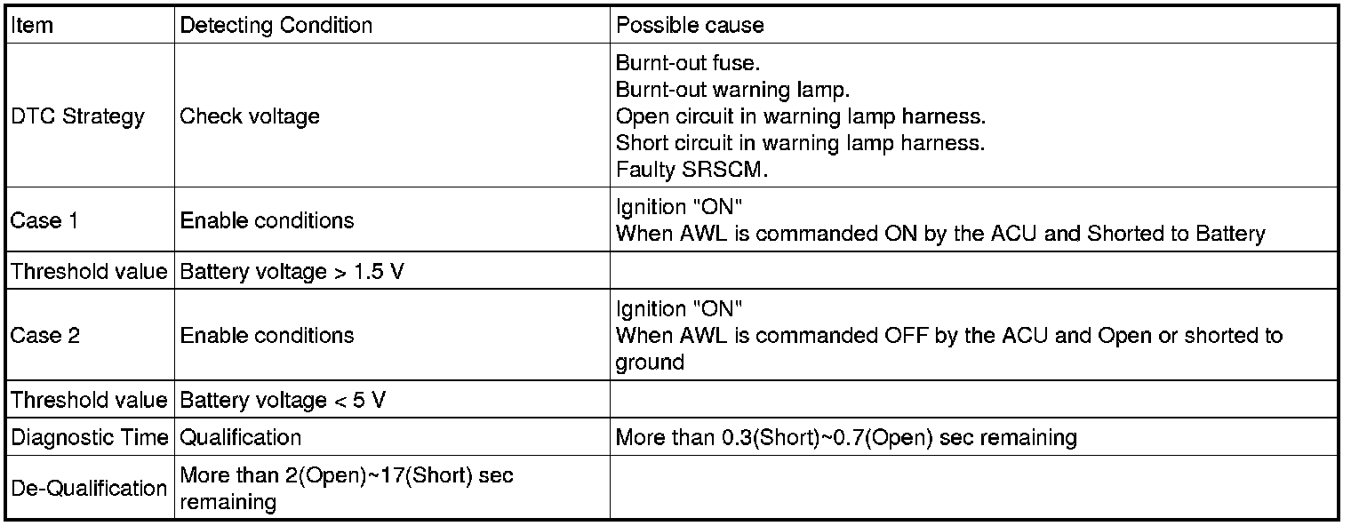 Air bag warning lamp is located at cluster. When key is in 'ignition on' position, SRSCM performs diagnosis of overall air bag system. If there's no fault, air bag. Warning lamp in cluster flickers for a while and then goes out. SRSCM measures voltage of out terminal of warning lamp to check if warning lamp is operated in accordance with signal SRSCM sends.