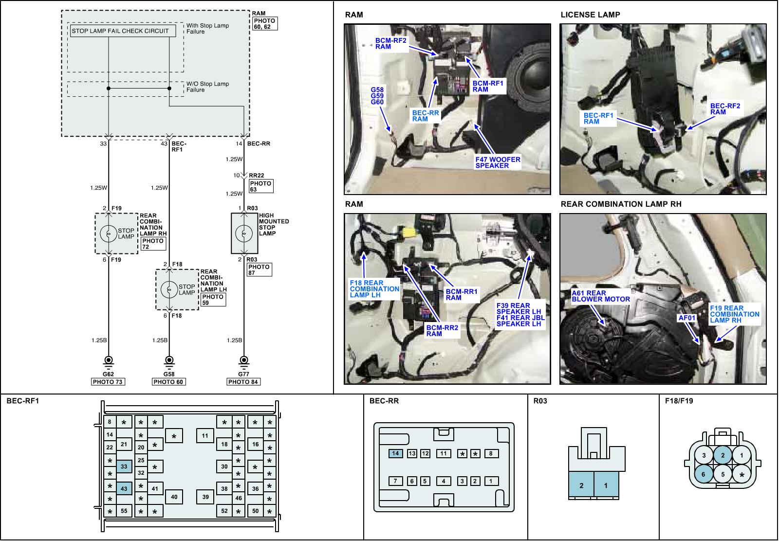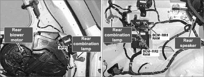 RAM is a component of BCM that consists of DDM, ADM, IPM, FAM, IMS and cluster module. Each part of BCM is connected to one another through CAN communication line for efficient communication. Those modules control front/rear, driver/passenger seat, cluster with electrical signal and they share information with other modules. RAM (Rear Area Module) set up at rear-left of passenger room controls various rear lamps (tail lamp, rear turn signal lamp, backup lamp, stop lamp, cabin lamp), window (sliding door power window, quarter glass, rear defogger), rear wiper and oil cap door. the power of stop lamp is supplied from the power line through FAM->stop lamp->RAM->lamp in sequence. Controlling stop lamp is performed at FAM and RAM. FAM transfers power from "HOT AT ALL TIMES power circuit" to stop lamp switch and via RAM, this power is supplied to stop lamp. Furthermore, RAM senses stop lamp circuit error as well.
