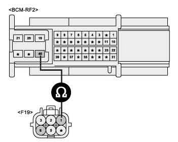 2. Measure the resistance between Right turn signal lamp power circuit connector terminal at RAM side (BCM-RF2-40) and turn signal lamp (F19-1).