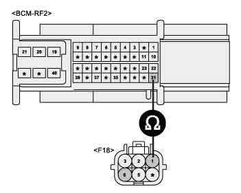 2. Measure the resistance between Left turn signal lamp power circuit connector terminal at RAM side (BCM-RF2-31) and turn signal lamp (F18-1).