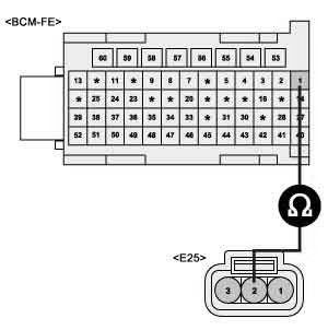 2. Measure the resistance between parking lamp power circuit of FAM (BCM-FE-1) and parking lamp (E25-2).
