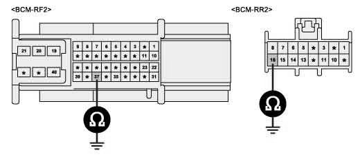 3. Measure the resistance between clearance lamp power circuit connector terminal at RAM side (BCM-RF2-37) and chassis ground.